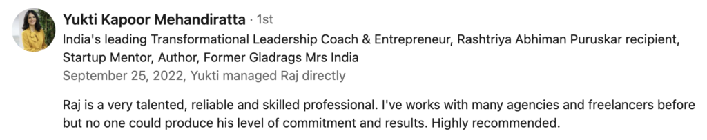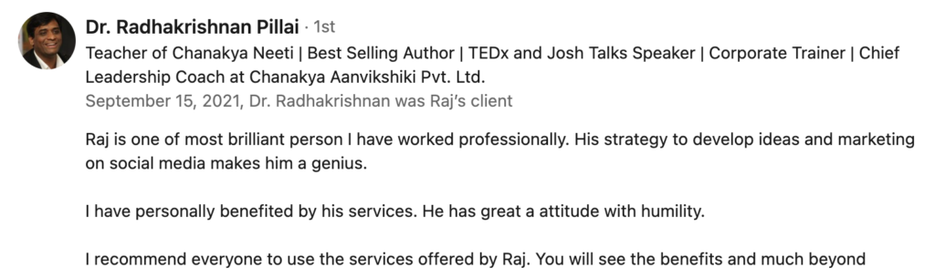 Then I got a chance to work with Dr Radhakrishnan Pillai India no.1 business author as a content marketing strategist to grow on Linkedin, Instagram, Twitter within one month we have 3X the growth Rate