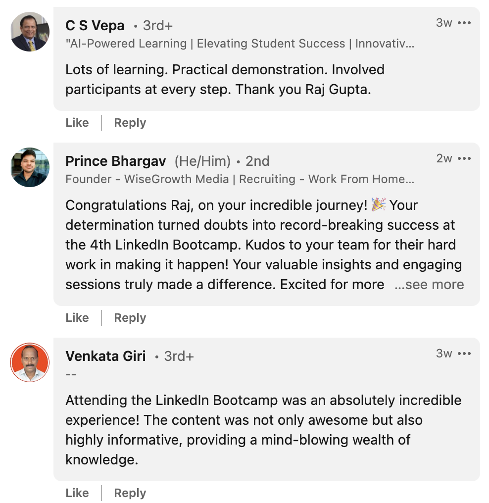 I also started the askrajgupta Show where I invite Speakers, trainers coaches for interviews So, all the things were possible because of Linkedin Therefore, I invite you to my Bootcamp  Looking forward to see you in bootcamp!